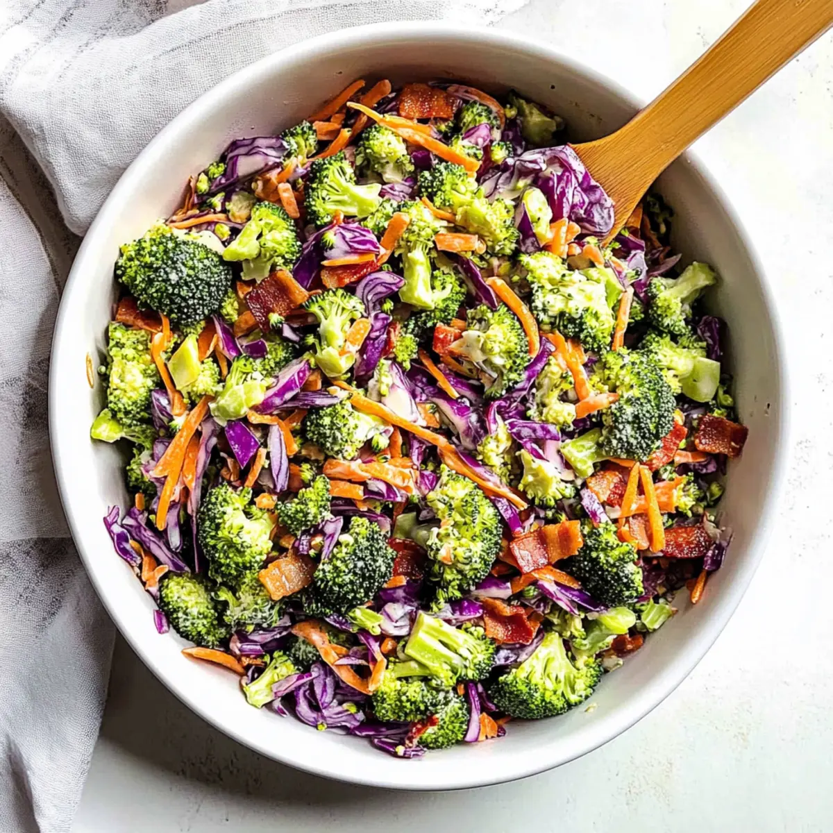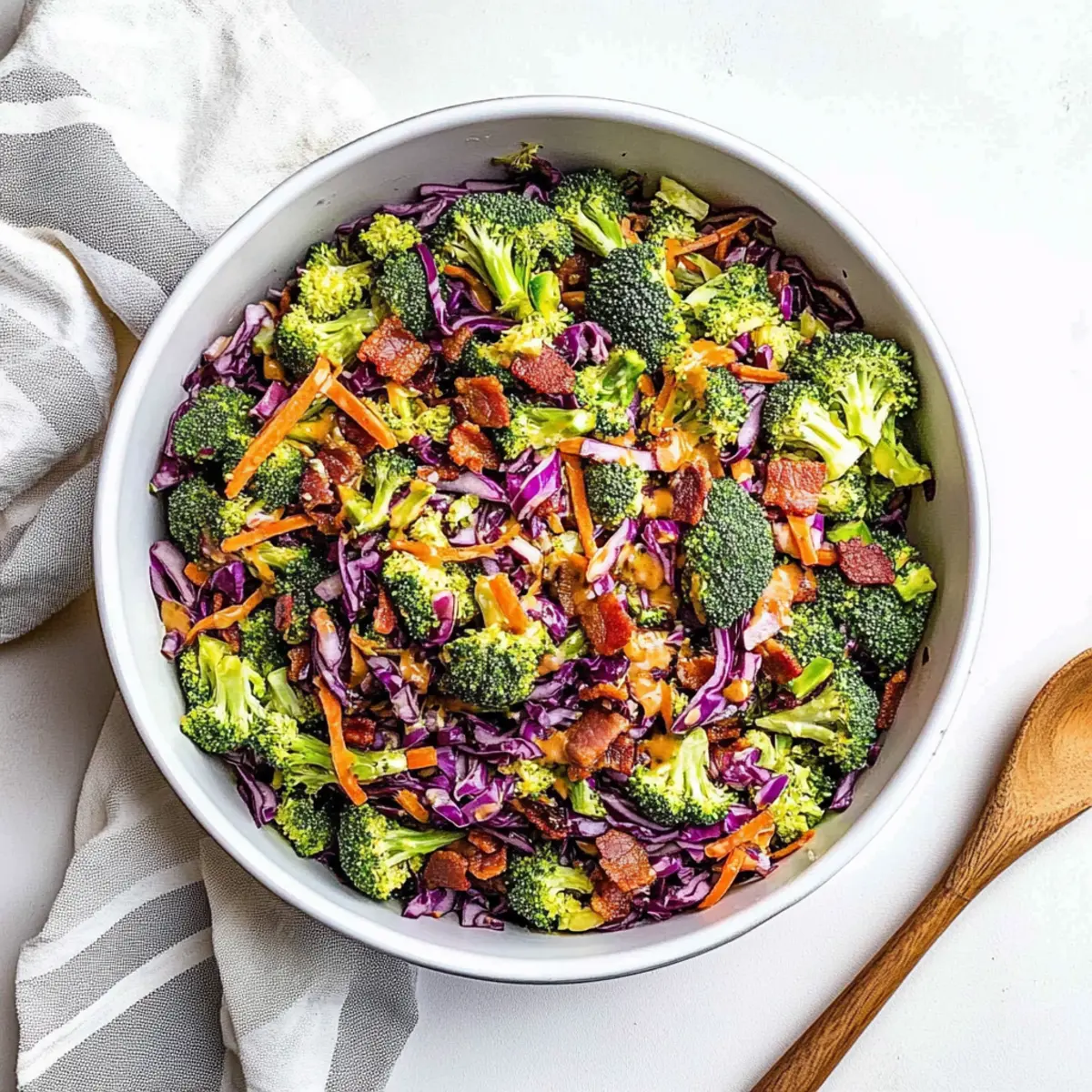- In a large mixing bowl, combine 4 cups of chopped fresh broccoli, 1 cup of crumbled bacon, ½ cup of finely chopped red onion, 1 cup of thinly sliced red cabbage, and 1 cup of shredded carrots. Gently toss the ingredients together with a spatula until evenly mixed.