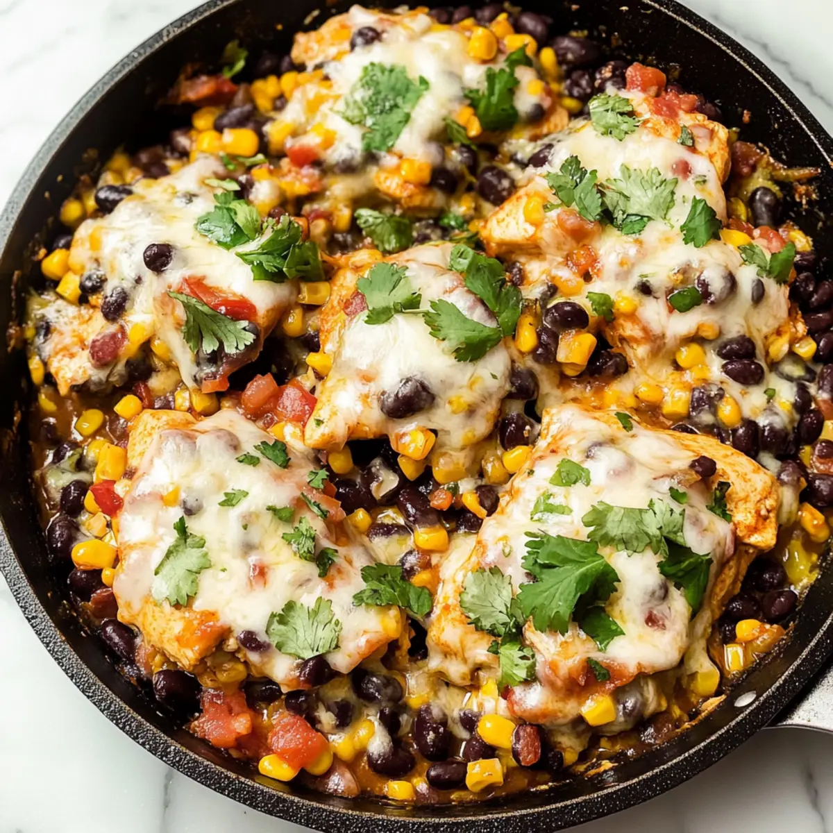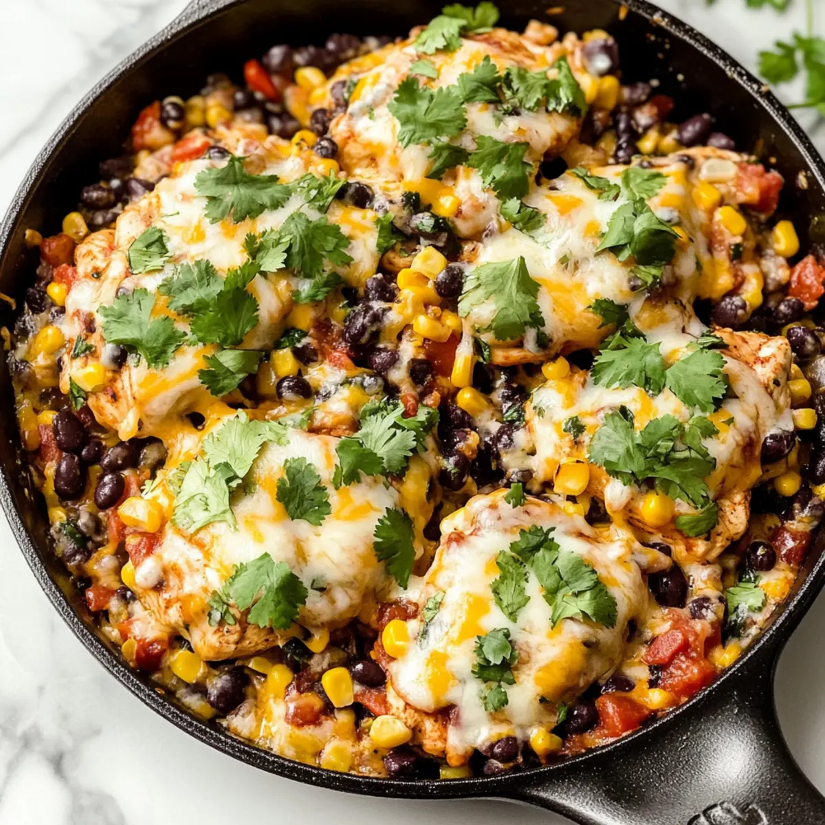 Once out of the oven, let the skillet rest for a moment to cool slightly. Garnish with freshly chopped cilantro for a pop of color and flavor before serving. This final touch not only enhances the presentation but also provides a fresh, vibrant taste that complements the hearty elements of your Santa Fe Chicken Skillet.