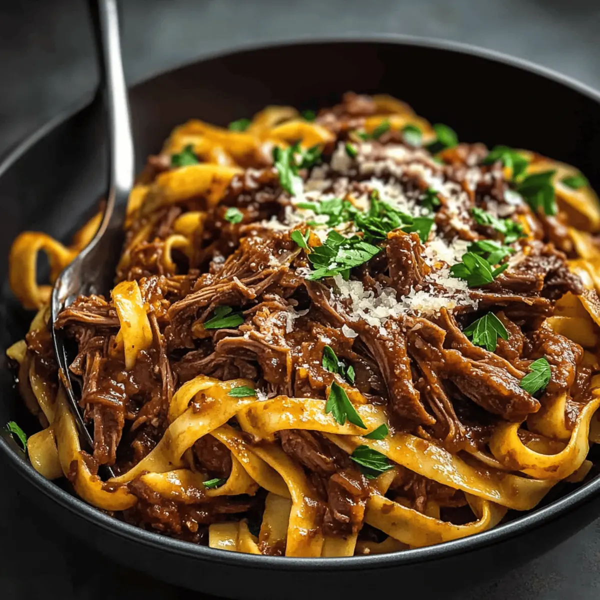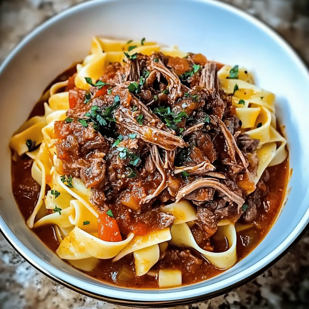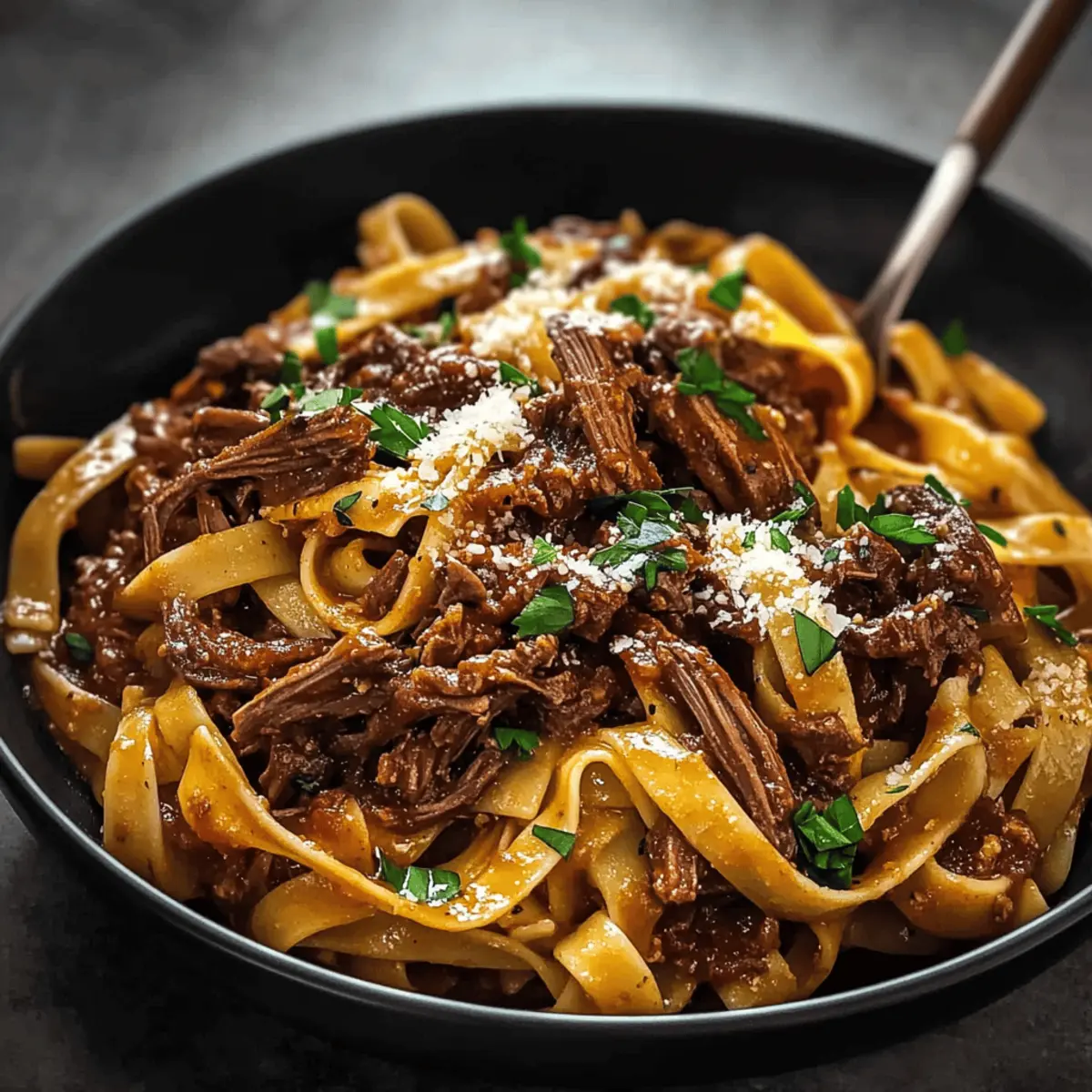- After cooking, discard the herb bundle and bay leaves. Shred the beef in the pot and adjust flavors with vinegar. Serve over pasta garnished with parsley and cheese.