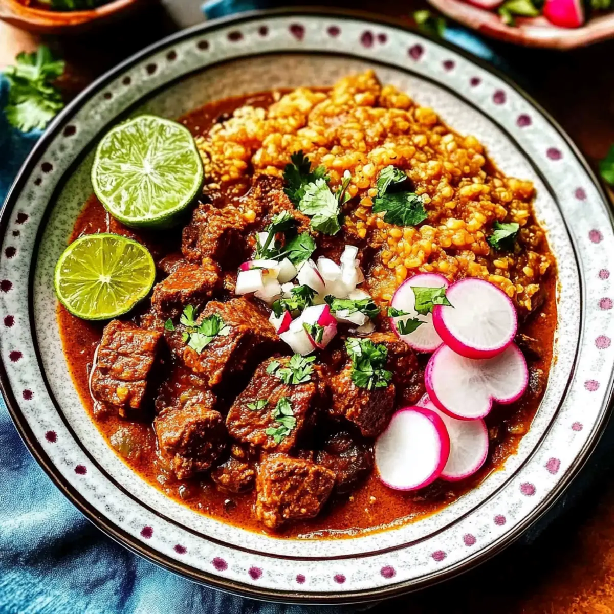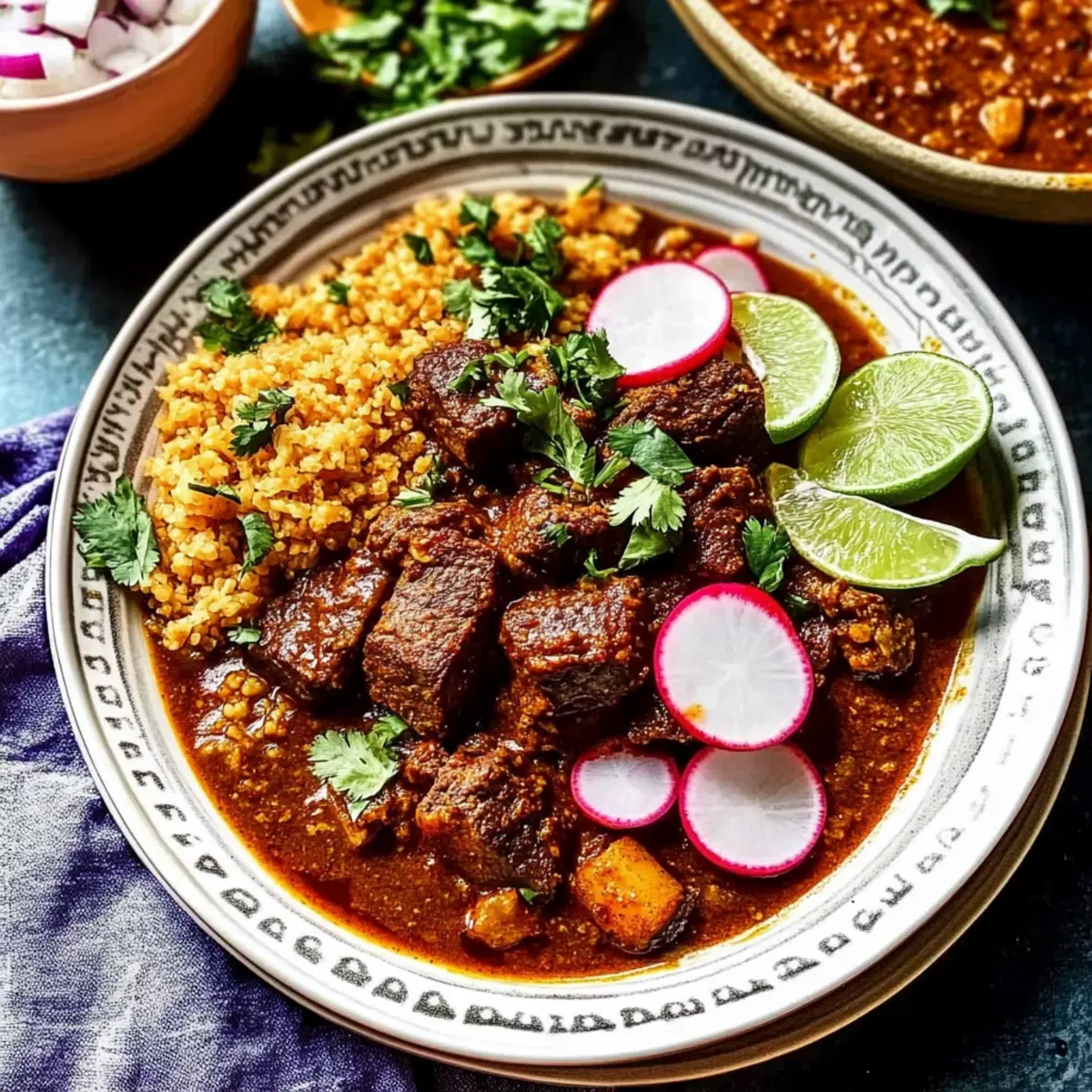 Once the beef is tender, skim any excess oil from the surface of the stew for a cleaner presentation. Serve your Beef Chile Colorado in bowls alongside warm corn tortillas. Garnish with fresh white onion, cilantro, radishes, and lime wedges for a burst of freshness that complements the stew beautifully.