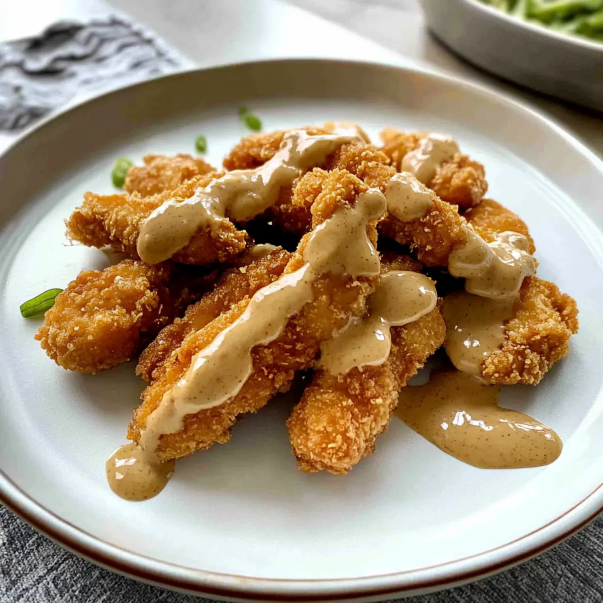 Once all the chicken is cooked, slice the crispy pieces into bite-sized portions. Arrange them on a serving plate and generously drizzle the creamy peanut sauce over the top. For a perfect finishing touch, feel free to garnish with chopped green onions or sesame seeds if desired. Dive into this delightful Chinese Peanut Butter Chicken that’s sure to bring smiles to your table!