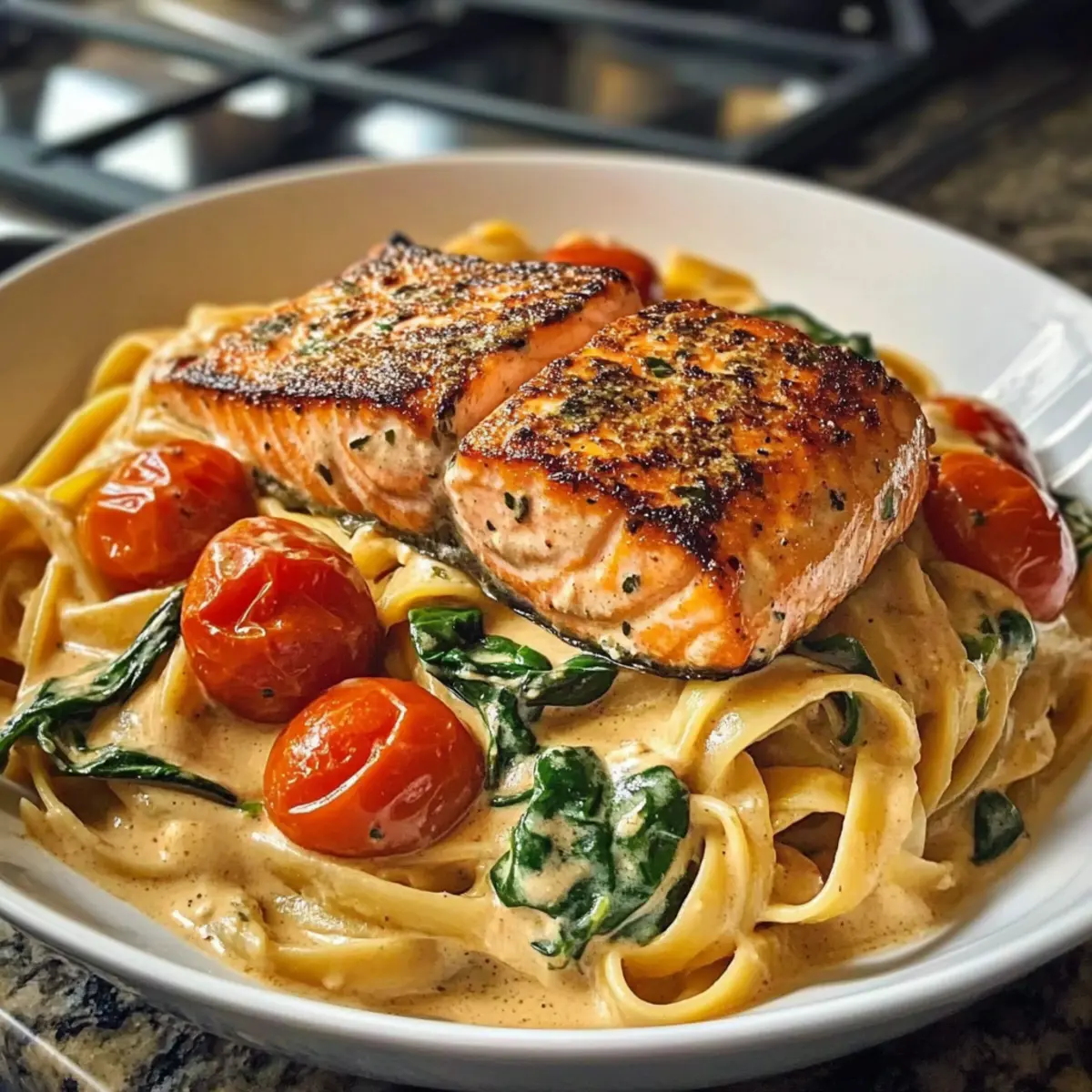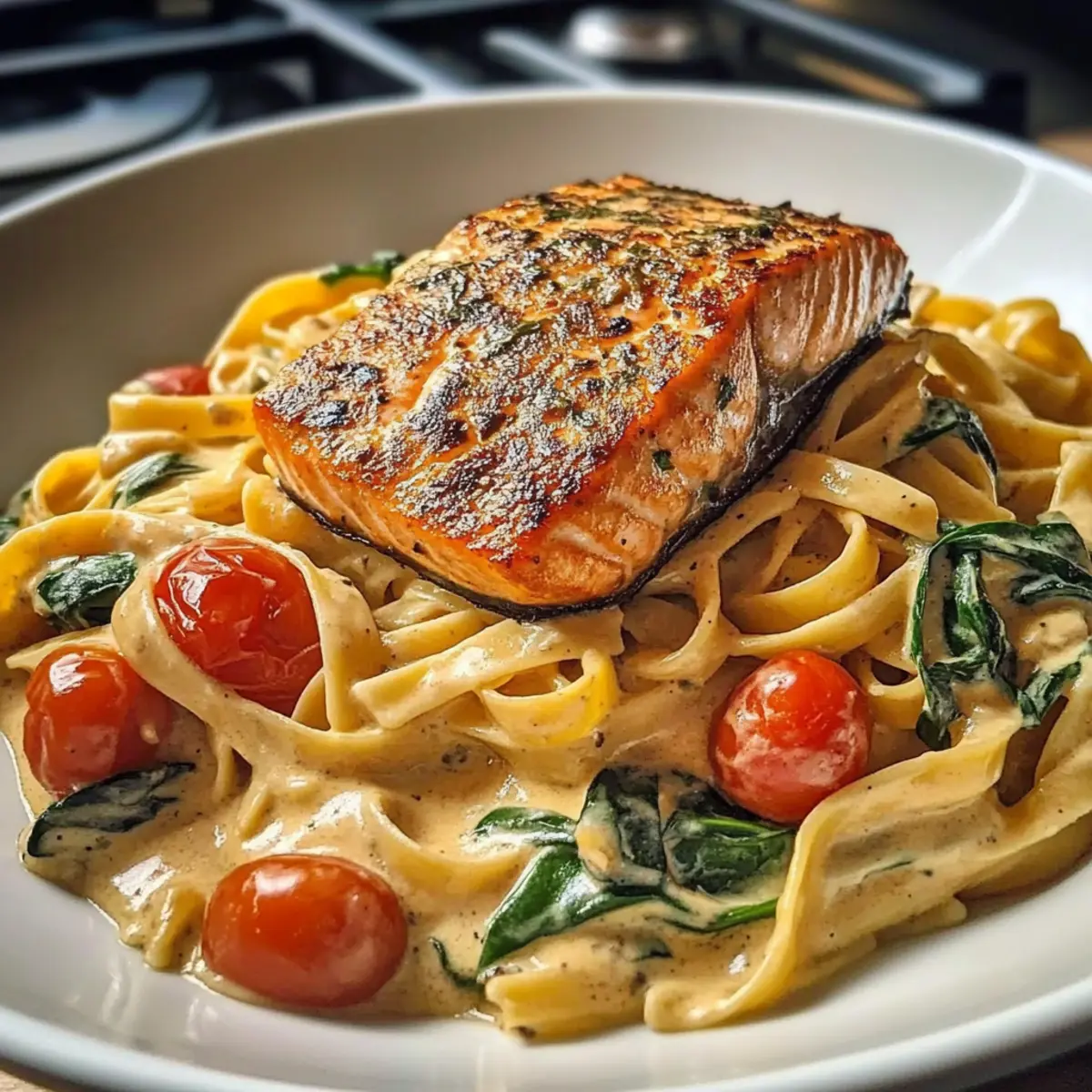 Irresistible flavor balance: The rich cream, savory salmon, and fresh spinach perfectly complement the sweet burst of cherry tomatoes, creating an explosion of taste.