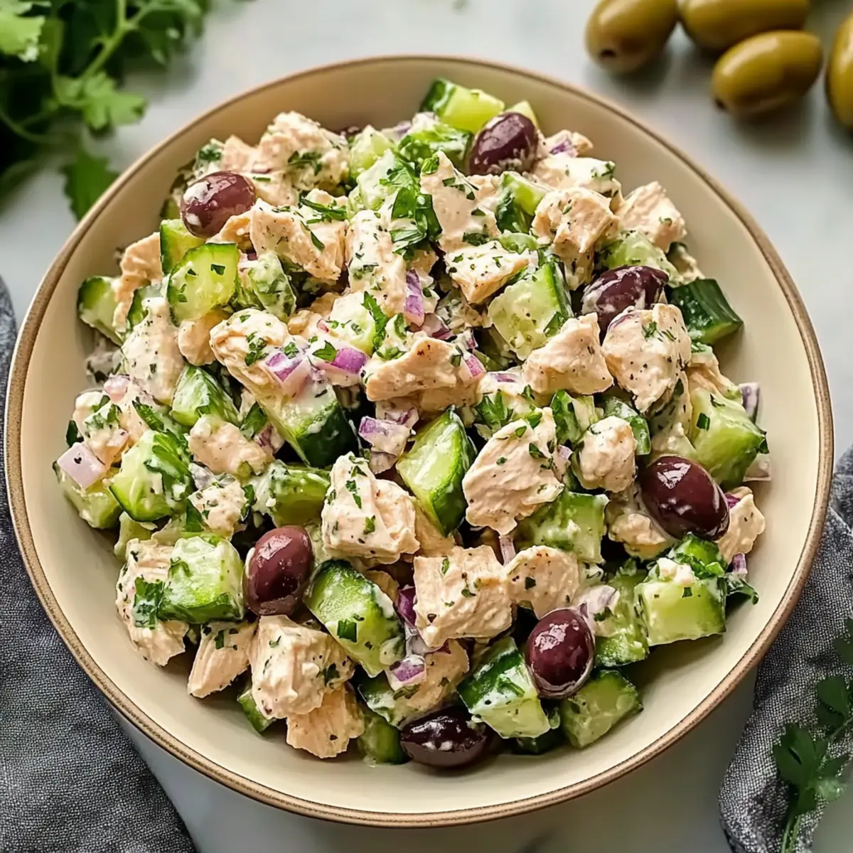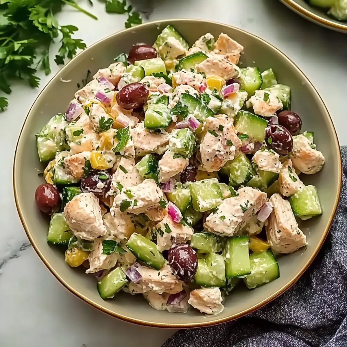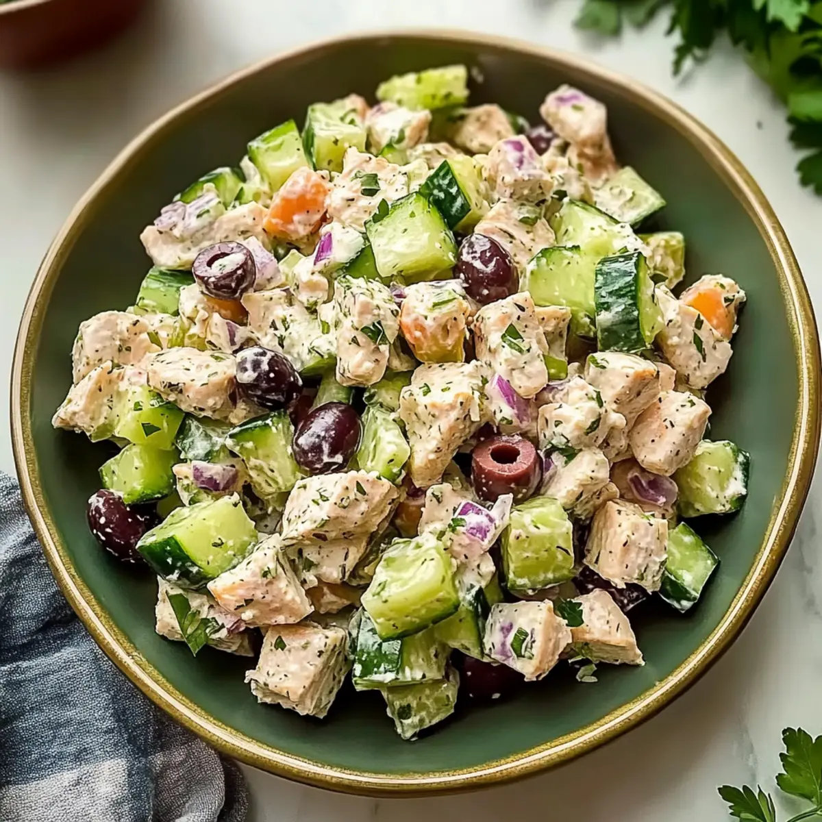 - Fold in the diced cucumber, minced red onion, crumbled feta, chopped olives, and fresh dill into the chicken mixture.