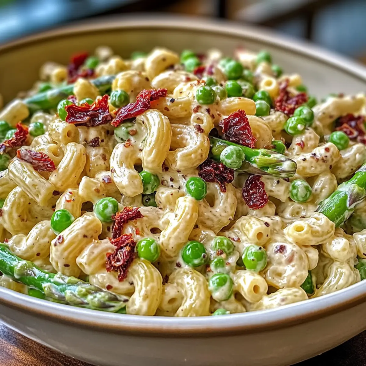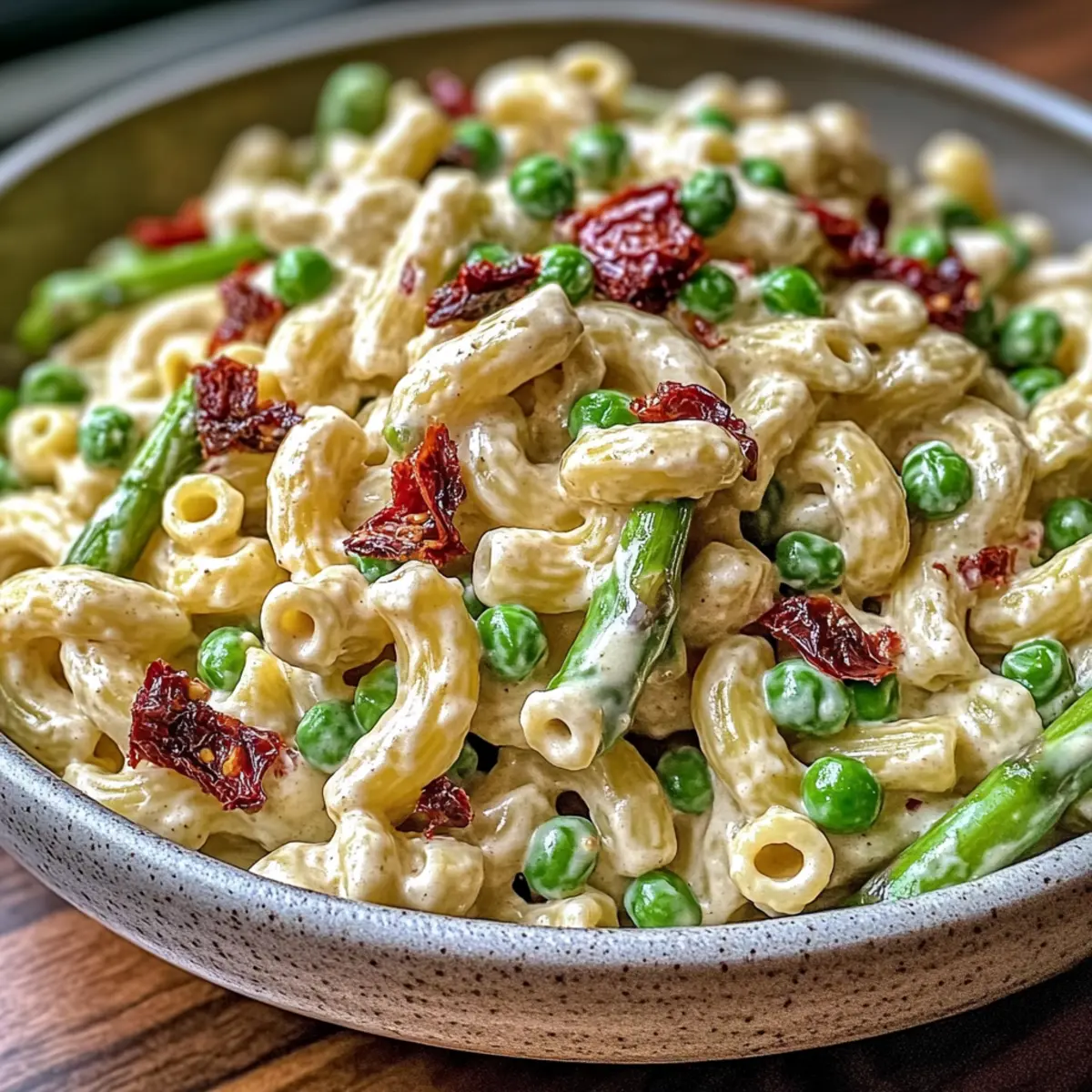 Once the pasta mixture is cooled, stir in 1/2 cup of chopped sun-dried tomatoes. This step not only adds a tangy flavor but also enhances the overall visual appeal of your Creamy Lemon-Dijon Asparagus and Pea Macaroni Salad. Cover the bowl and let it chill in the refrigerator for about 15-20 minutes, allowing the flavors to meld beautifully.