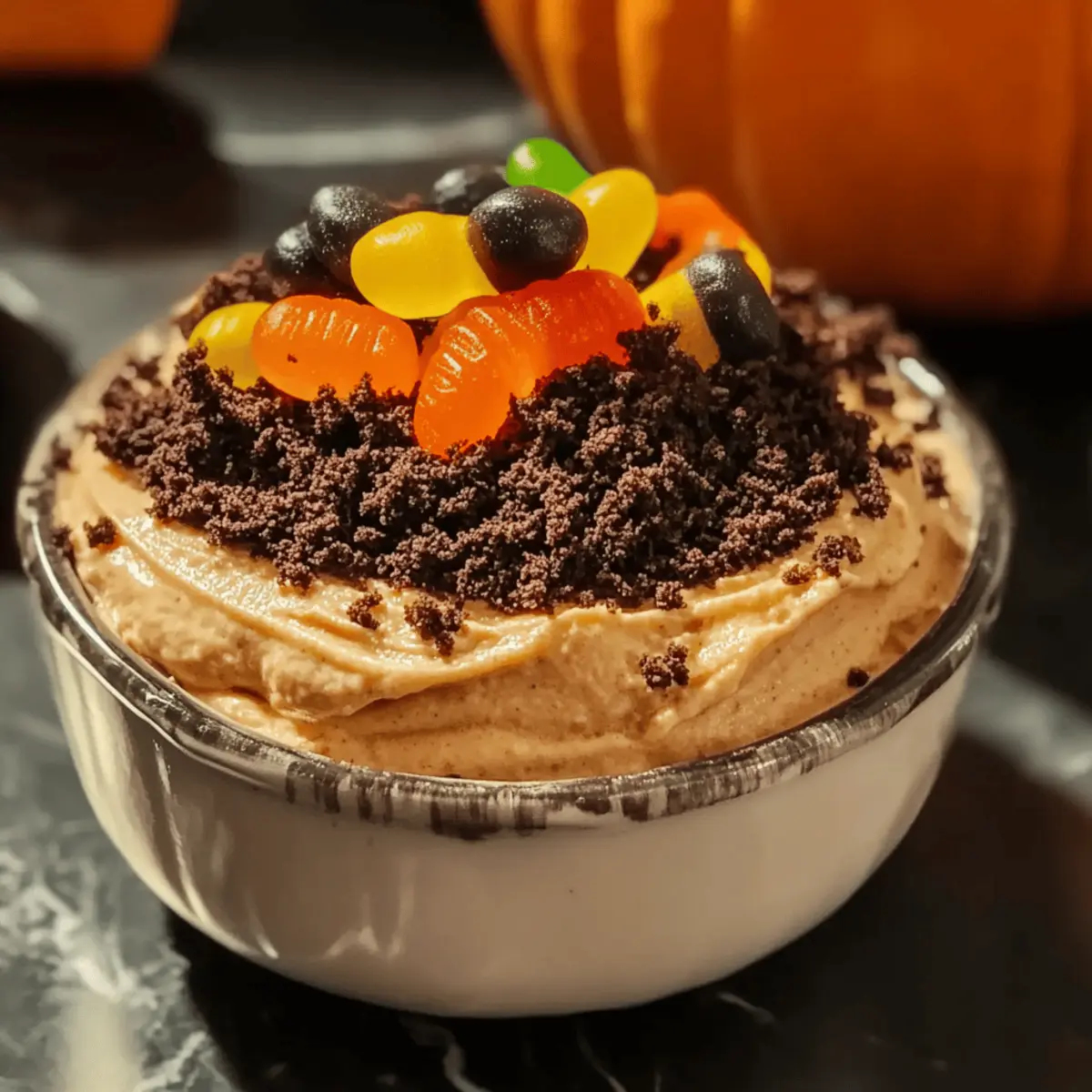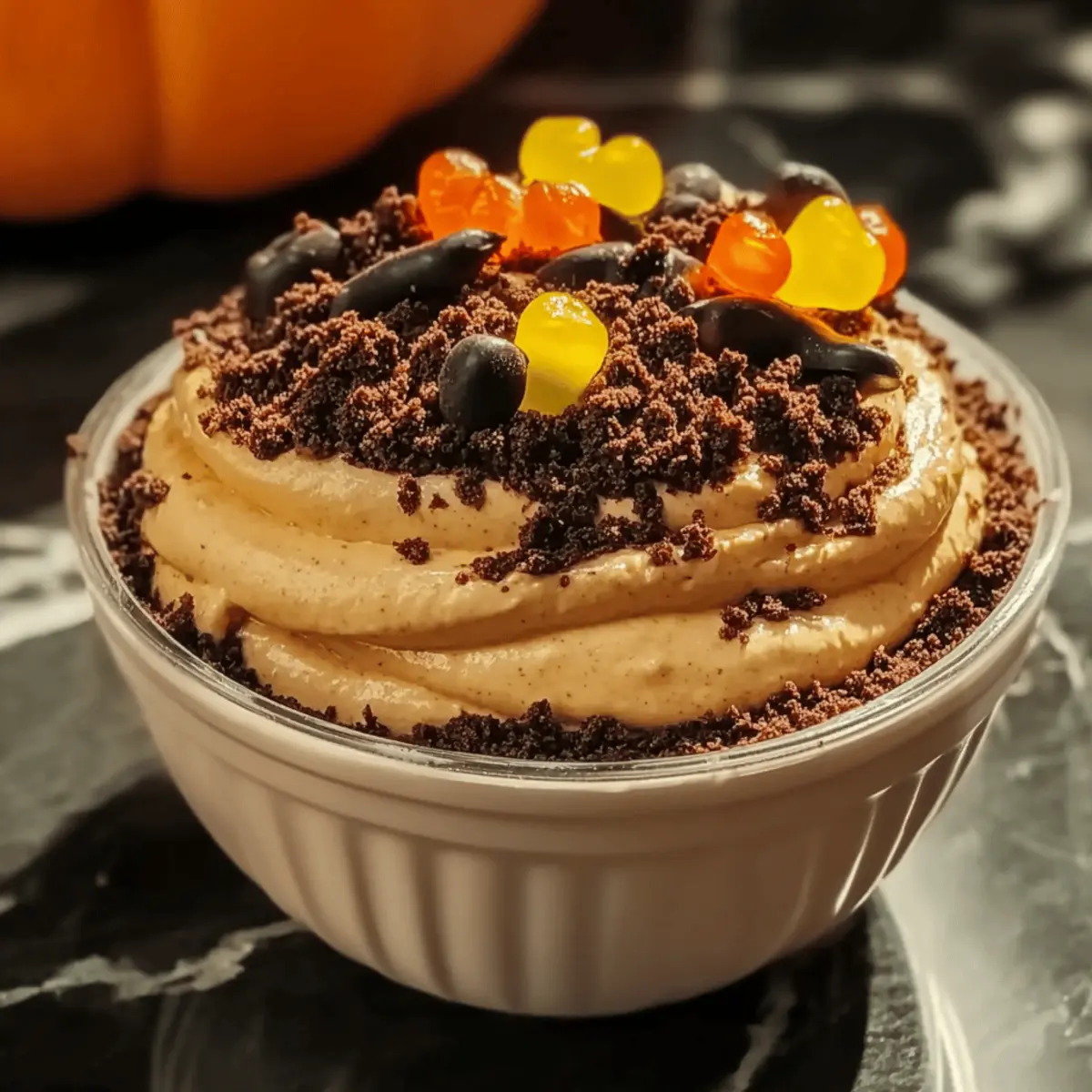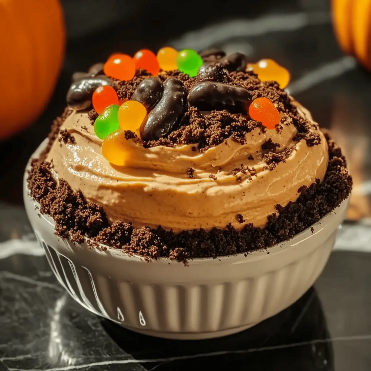 Evenly sprinkle the crushed cookie mixture over the top of your prepared Pumpkin Cheesecake Dip, making it look like a delightful layer of dirt. This crumbled topping adds a fun, Halloween-inspired touch that contrasts beautifully with the creamy dip. If desired, gently place a few gummy worms on top for an extra spooky decoration.