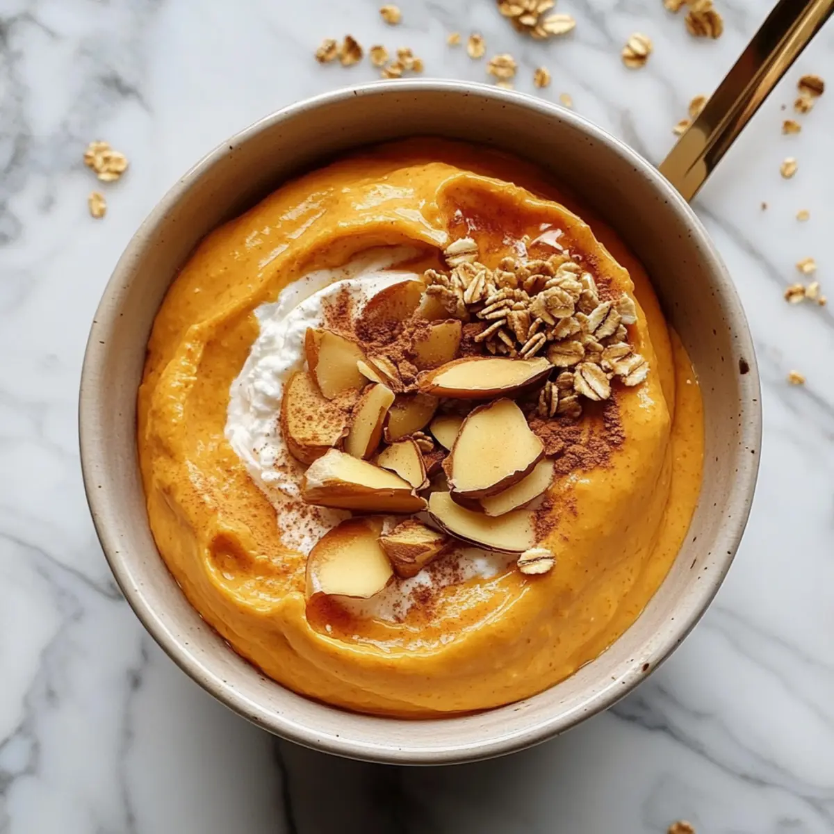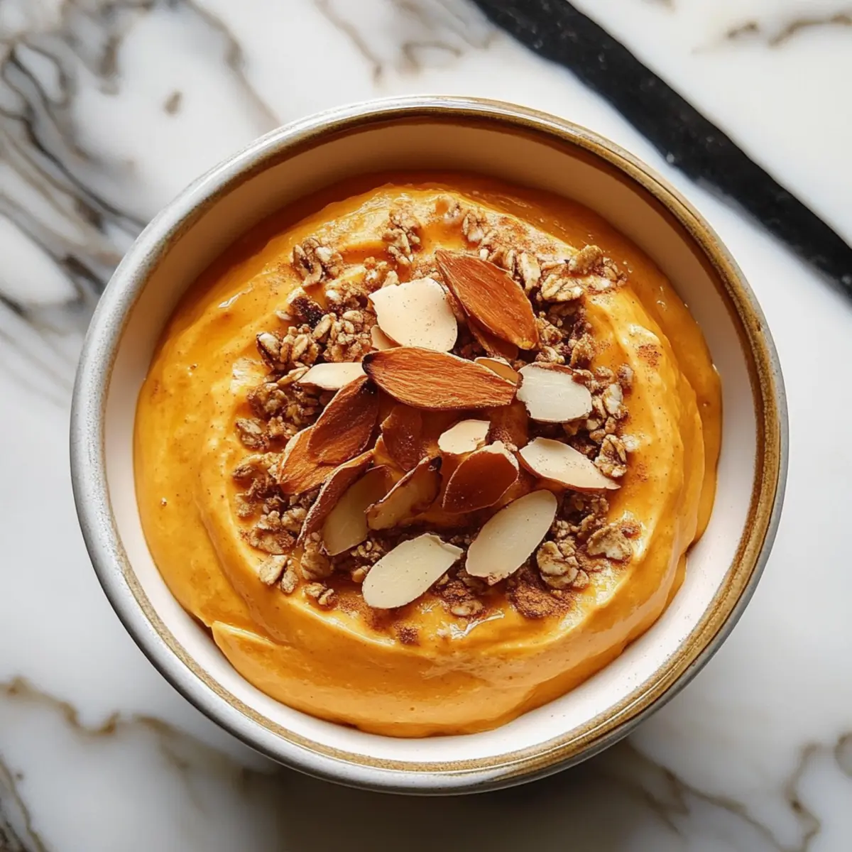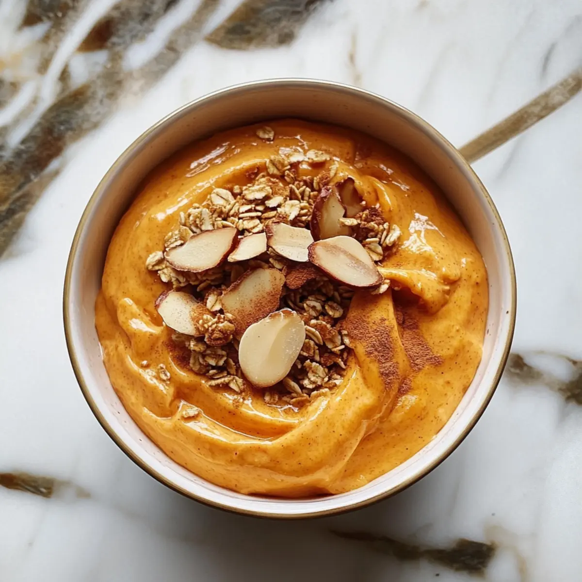 Once blended, take a moment to taste the mixture. Adjust the sweetness with more honey if preferred, then transfer the whipped pumpkin blend into serving bowls. Use a spoon to evenly portion the thick, creamy texture, creating a delightful base for your toppings. The vibrant orange color paired with the creamy white will make for an inviting breakfast display.